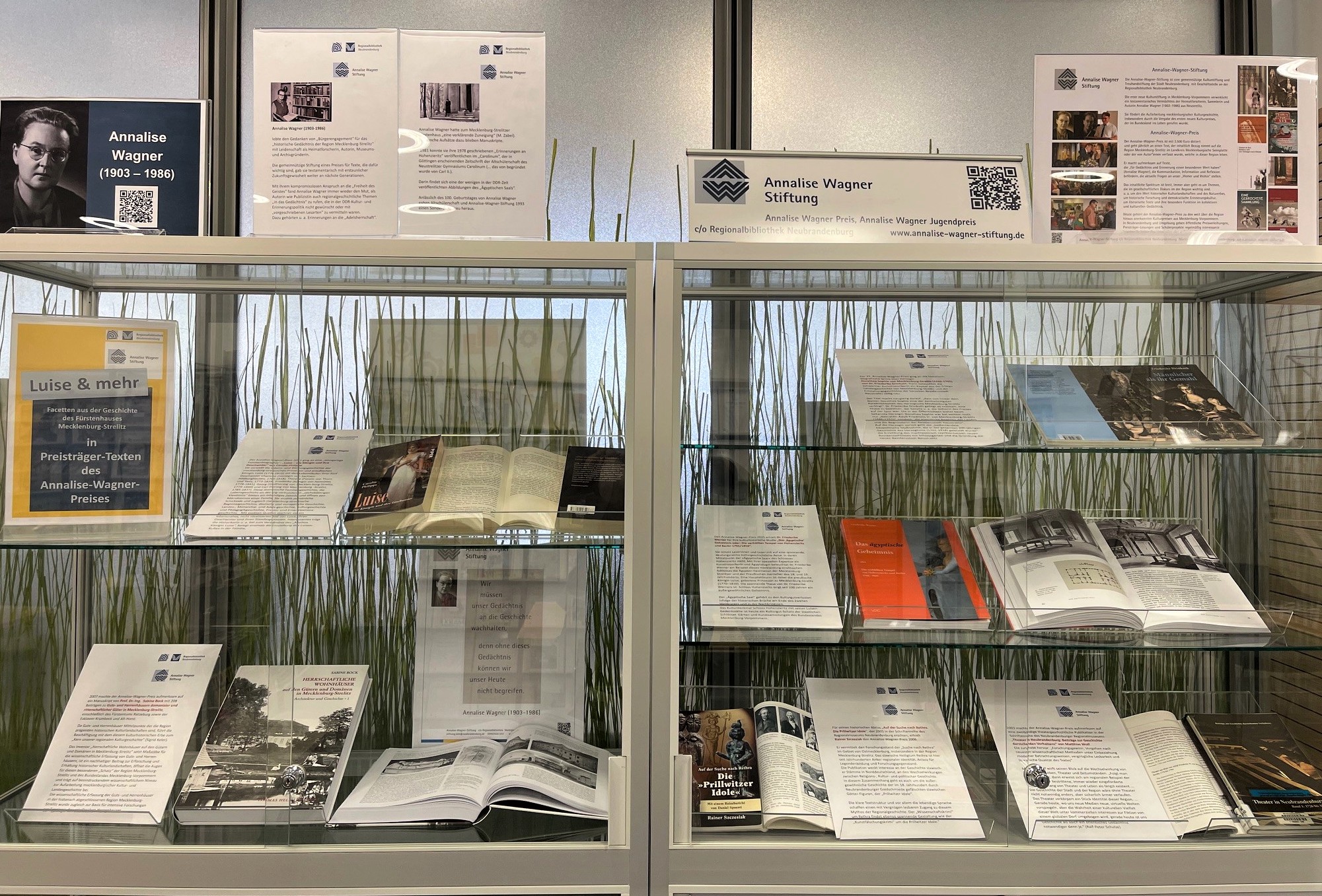 Auch die Neubrandenburger Regionalbibliothek zeigt momentan eine kleine Ausstellung historischer Publikationen aus der „Luisen-Literatur“ in den Bibliothekssammlungen, die das „Mythos Königin Luise“ reflektieren. Die Annalise-Wagner-Stiftung macht ergänzend neugierig auf „Luise & mehr“ - auf Facetten zur Geschichte des Fürstenhauses Mecklenburg-Strelitz in Preisträger-Texten des Annalise-Wagner-Preises. Zu entdecken gibt es zum Beispiel „Luises Familien-Geschichte(n)“ in Geschwister-Briefen, Schloss Hohenzieritz in der mecklenburg-strelitzschen Architekturgeschichte oder aus kunstgeschichtlich-ägyptologischer Perspektive, die (Achtung!) Stadtgründerin von Neustrelitz, einen großherzoglichen Wildpark der heute Weltnaturerbe ist oder Kunst-Geschichte(n) mit Bezug zur Fürstenfamilie, von Prillwitzer Idolen bis zu Kunstsammlungen oder „Theater in Neubrandenburg“.